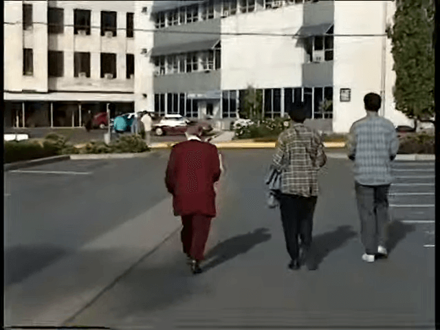 He was wearing black sweatpants and a black t-shirt with a patch on the sleeve saying "Heaven's Gate Away Team".